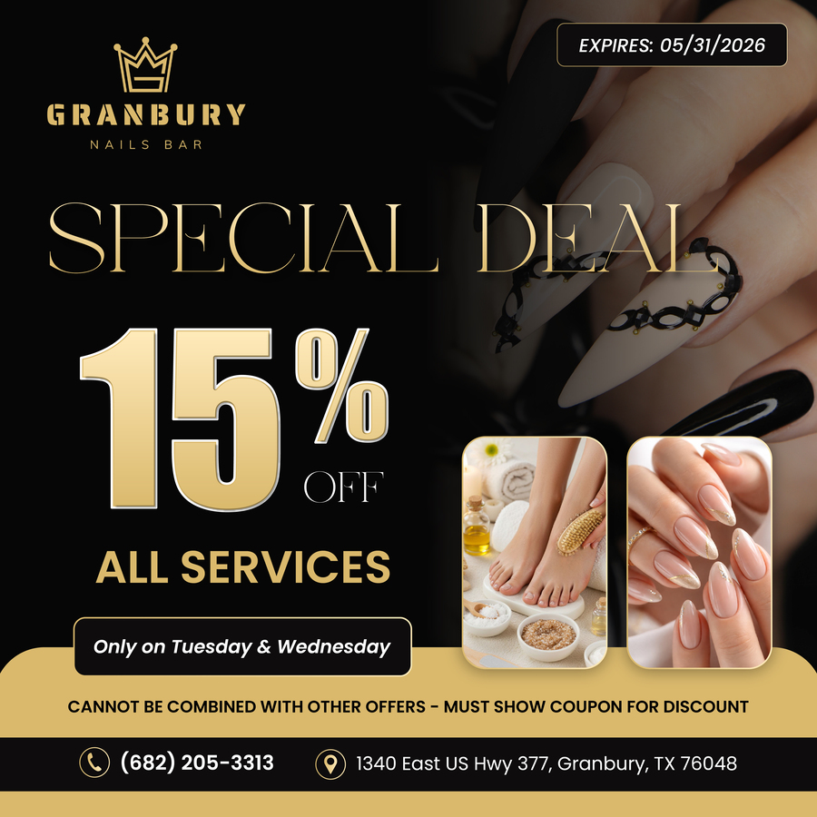 Welcome to GRANBURY NAILS BAR. Located at a beautiful place in Granbury, TX 76048. GRANBURY NAILS BAR offers the ultimate in pampering and restoring your beauty with our whole-hearted, careful & professional staff. Comprehending customer is not an easy task. It’s even harder when it comes to nail art & caring services.